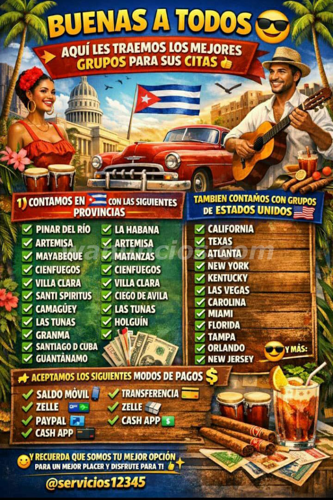 HOLA SI ESTAS PENSANDO VENIR A LA ISLA Y NO TIENES CONPAÑIA NO DUDES EN ESCRIBIRNOS CONTAMOS CON GRUPOS DE CHICOS SCORT EN LA HABANA Y PROVINCIAS NUESTROS CHICOS ESTAN DISPONIBLES 24H AL DIA A LA DISPOCICION DEL CLIENTE